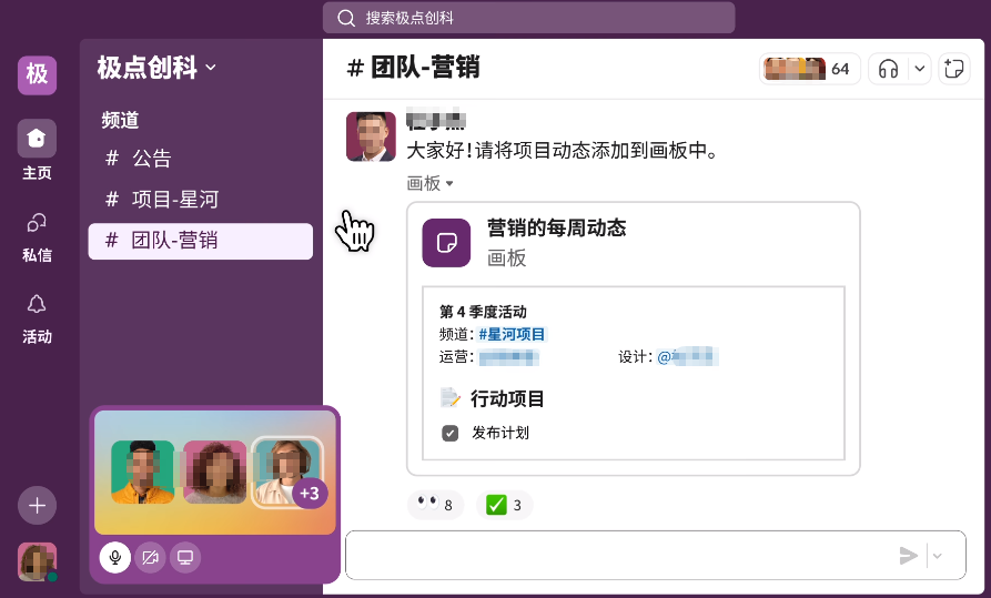 采用情境化频道设计,按项目、职能智能分类协作空间,集成AI自动归档与决策支持工具。
