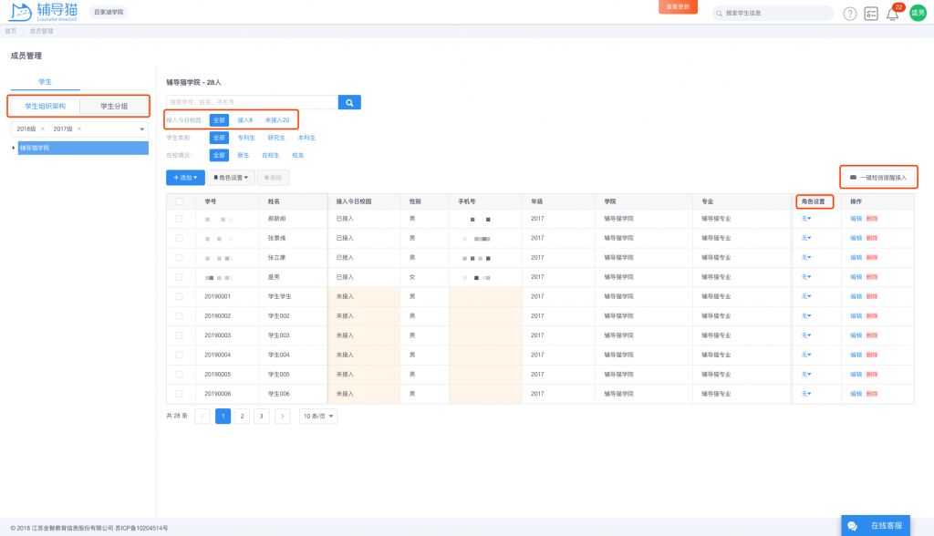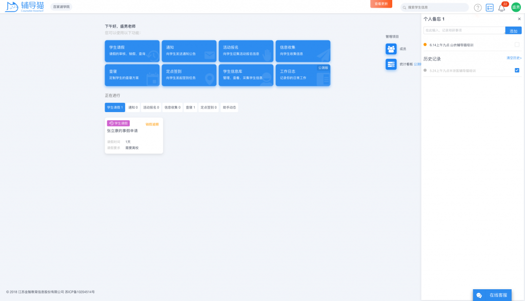辅导猫涵盖学生信息收集、整理、分析和反馈,以及日常事务处理等功能,软件拥有强大的数据比对功能,能够快速发现异常数据,通过数据分析帮助辅导员更好地把握学生的整体情况,还可生成学生电子档案、学生画像等,为管理决策提供依据。