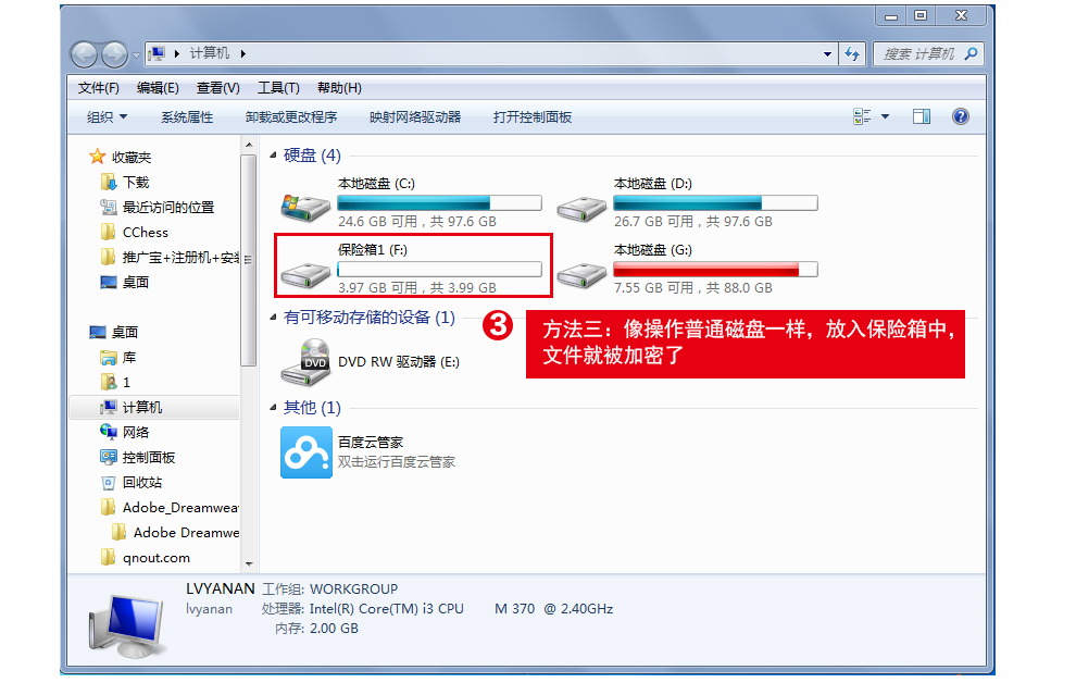 隐身侠可以在电脑硬盘和任意的移动存储产品中新建保险箱,包括 U 盘、移动硬盘、MP3 等,甚至是局域网内的服务器硬盘,属于系统级加密;保存在保险箱内的重要资料始终保持在高强度加密系统之内,只有用户自己能看到和打开。