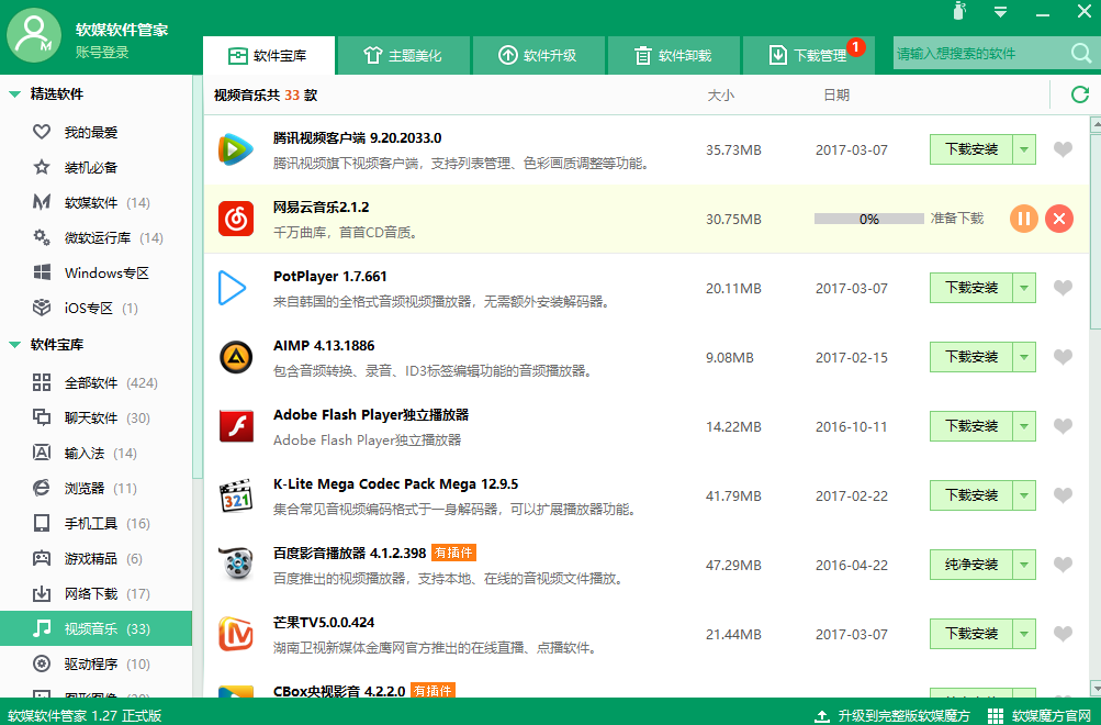 软媒软件管家提供“装机软件一键安装”功能,方便用户在重装系统后快速安装常用软件集合,软件还可以彻底卸载软件,并智能扫描和清理其残留的注册表项、临时文件和缓存目录,避免系统因软件卸载产生垃圾。