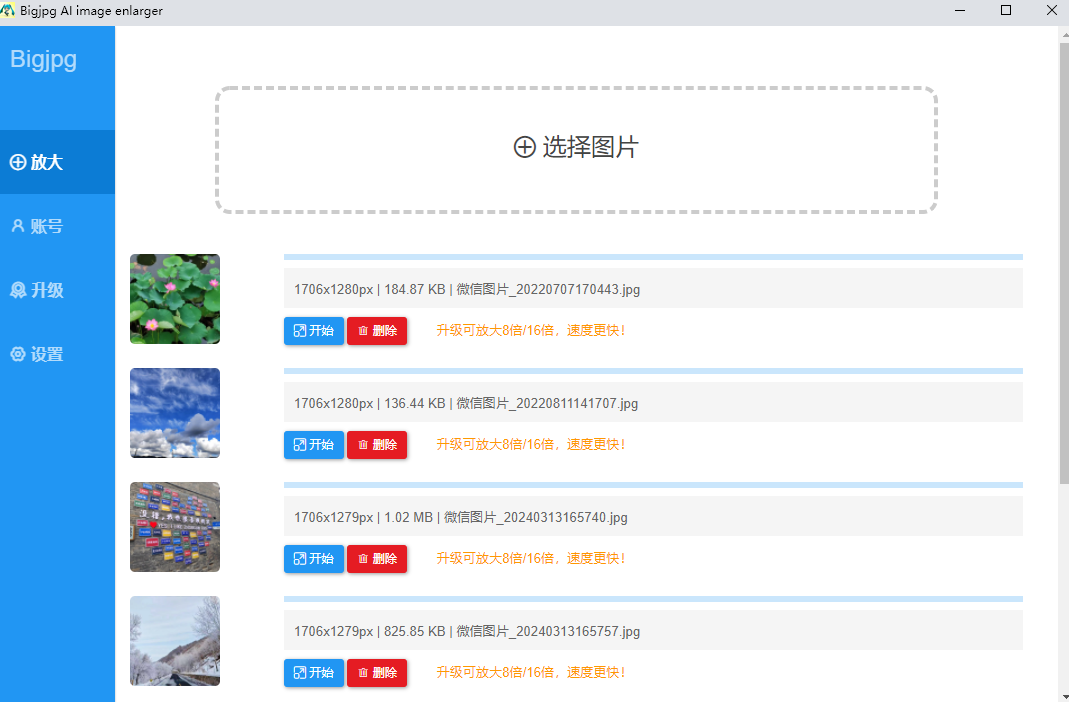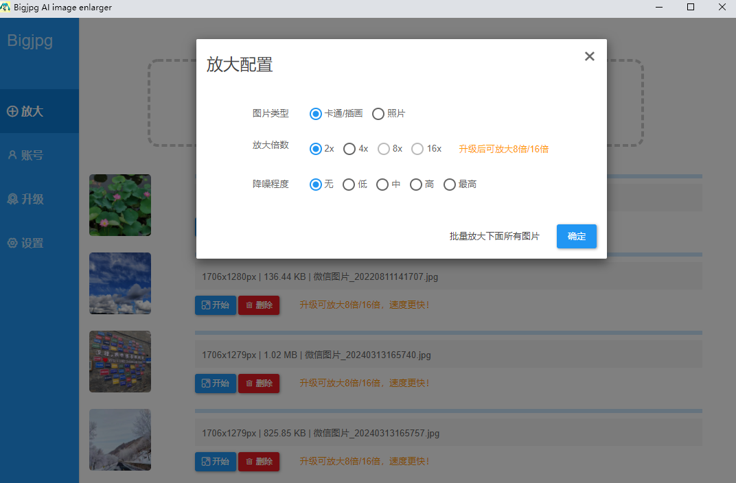 bigjpg是一款功能很强大的图像放大软件,bigjpg电脑版之中用户可以将小图片放置在软件之中,软件可以利用AI功能,让图片可以从低像素转换成为高像素图片,并且软件转换不会造成失真效果,用户办公使用时起来无需担心图片过于AI无法得到展示
