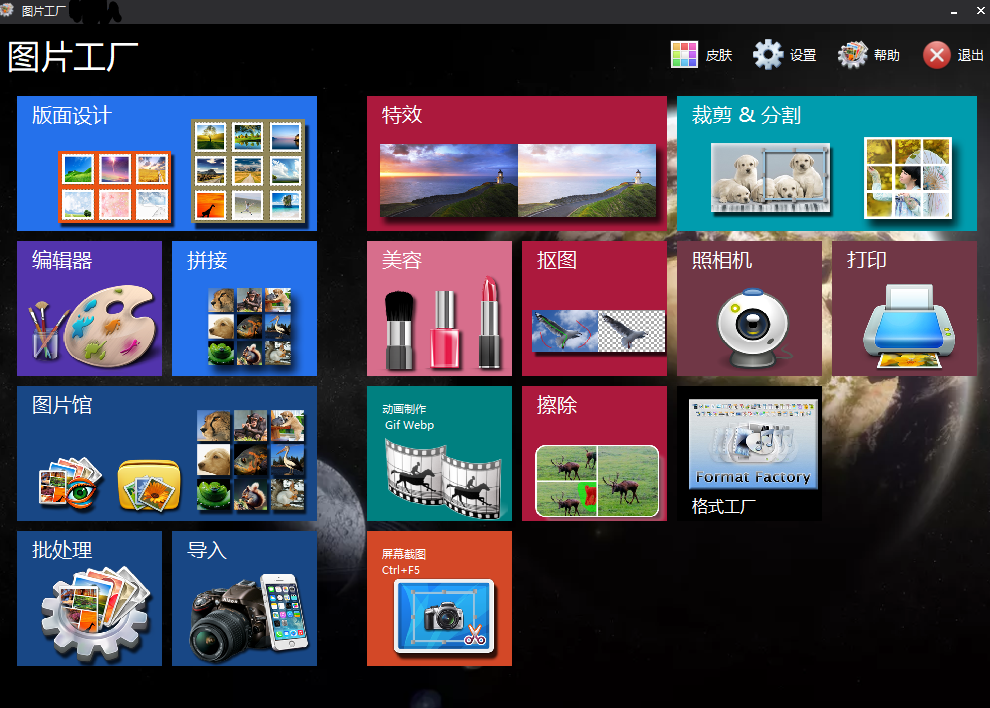 图片工厂操作界面简洁,功能操作多为傻瓜式,新手也能快速上手,软件功能包含版面设计、特效处理、裁剪分割、拼接、美容、抠图、动画制作等众多内容,并且软件有着强大的批量处理功能,可以帮助用户进行内容处理。