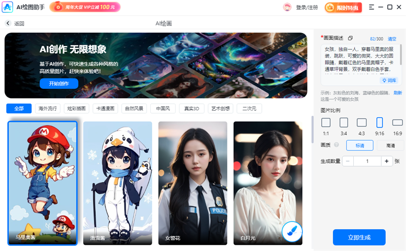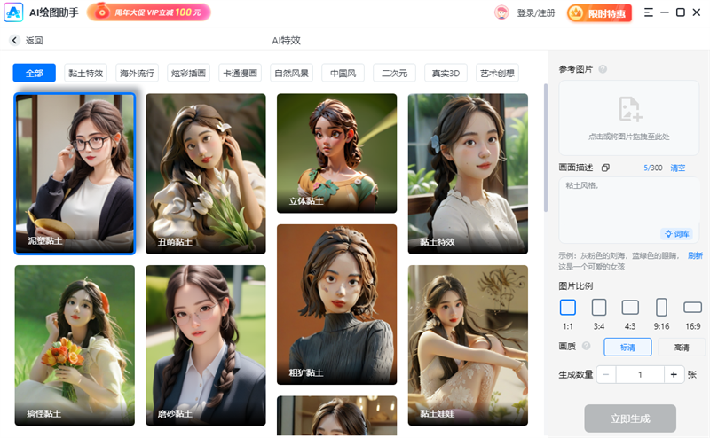 内置多种绘画风格可选,涵盖艺术、数字及写实风格,满足不同场景创作需求。