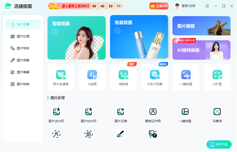 提供AI智能抠图功能,精准识别主体并快速完成抠图处理,支持人像与物品。