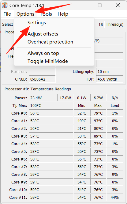 Core Temp能够实时监控每个处理器核心的温度,支持多核处理器,温度数据显示为每个核心的独立值,使用户能够精确地了解 CPU 各个核心的运行状态,默认界面显示 CPU 温度以及相关的处理器型号、频率、负载等信息。