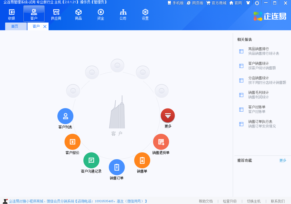 企连易是一款好用的营销平台,企连易电脑版之中用户可以在软件之中做好内容运营,软件有着详细的客户信息以及积分功能,可以帮助用户做好门店的余额查询,让用户可以在全国各地的门店都可以直接进行消费,同时也可以查询各个门店的进销存情况。