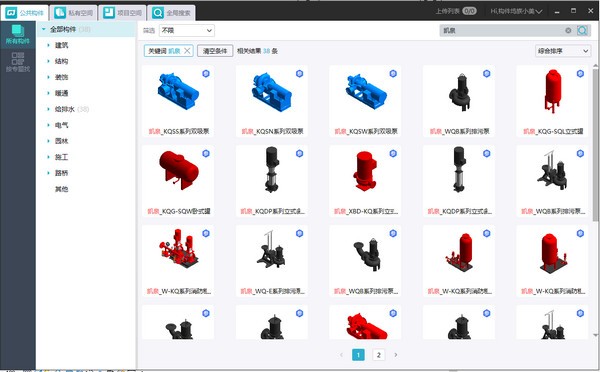 构件坞构件累计近 3 万个,包含通用构件和真实产品构件;软件支持支持方案设计、详细设计、深化设计等多个设计阶段,为工程建设项目的全流程提供构件支持,用户可通过关键词、分类、标签及版本对需要的构件进行搜索,搜索准确率 98% 以上,能够快速帮助用户找到所需构件。