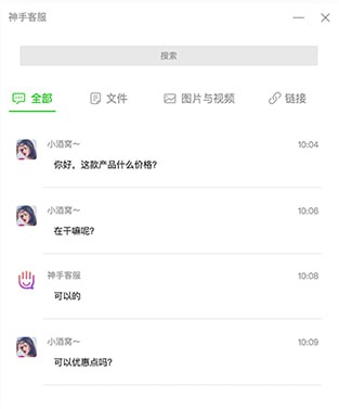 聊天记录分类查看能力,文件、图片等消息可单独筛选,便于客服交接与信息追溯。