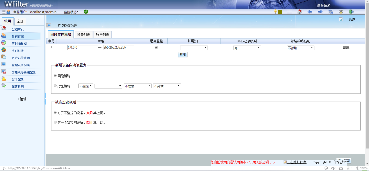 WFilter能够自动识别并列出局域网内的所有设备,包括计算机、手机、平板等,管理员可以针对每个设备设置具体的管理策略,支持将设备按部门、用户组等方式进行分类管理,从而实现灵活的访问控制。