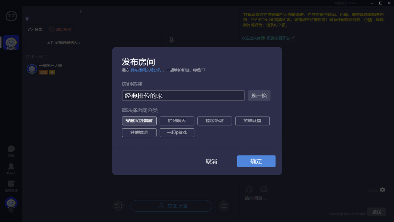 TT语音是一款非常强大的语音软件,TT语音电脑版之中用户可以通过房间号进入到语音聊天之中,在语音之中用户可以自由进行设置语音方式,该软件一个房间可以百人共同参加,可以设置好发言模式,非常适合游戏工会、组队等用户使用。
