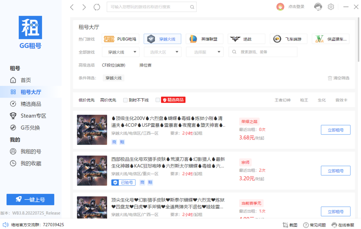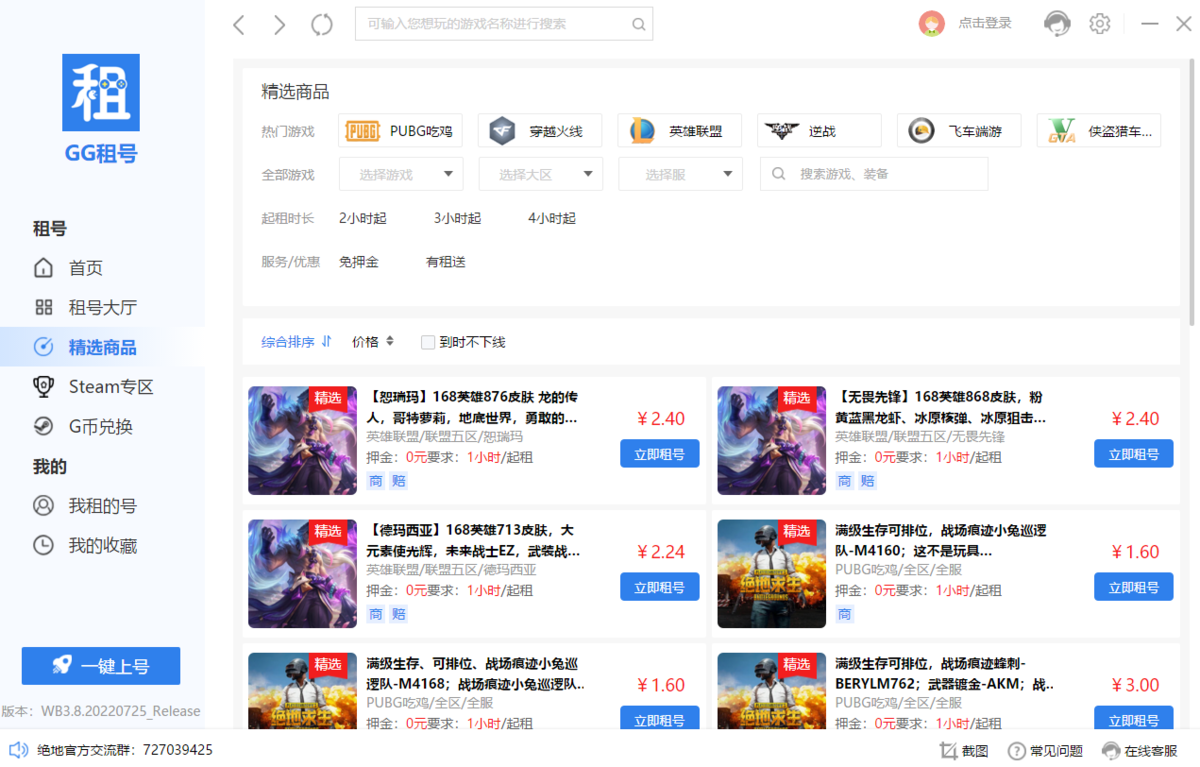GG租号是一款好用的租号工具,GG租号软件之中用户可以在软件之中体验各种游戏大神的账号,这些账号基本都有着各自特色,有些是全皮肤用户都可以直接使用,还有全成就、段位大神号等等特色,但是价格都不一样,用户可以根据自己的需求来租号。