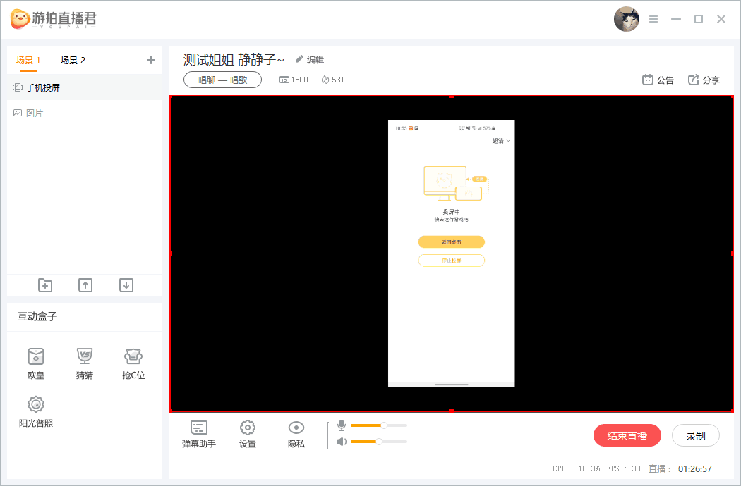 游拍直播君支持前置摄像头捕获,可将主播画面以“画中画”形式叠加在游戏画面上,增强互动感和亲切感,还可以使用麦克风语音同步录制和直播,方便主播进行实时解说、互动和吐槽,软件支持软件内显示直播平台的弹幕,主播无需切换App即可看到观众留言并进行互动。