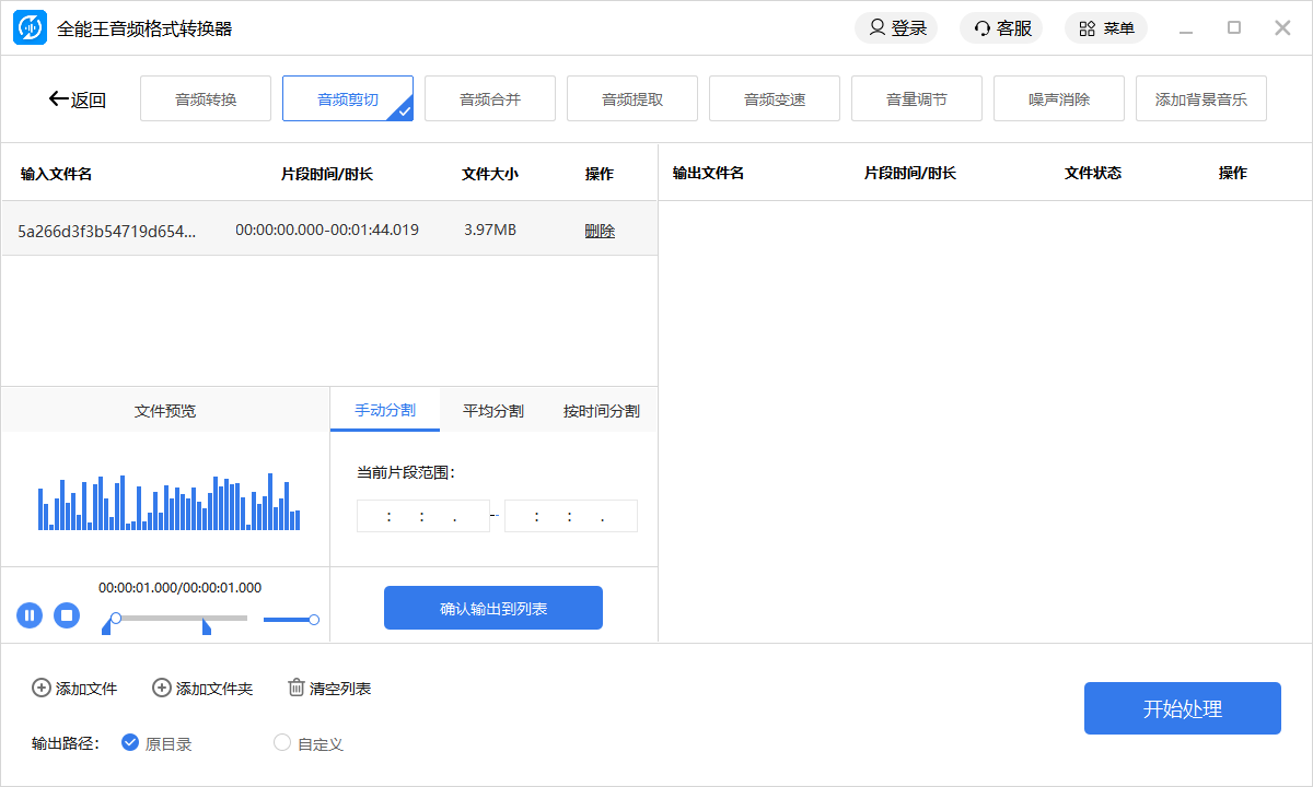 全能王音频处理大师是一款很好用的音频剪辑工具,全能王音频处理大师电脑版之中用户可以直接进行音频文件处理,软件可以对音频文件进行内容噪声消除或者音频剪切等等操作,让音频可以变得更加方便用户进行处理。