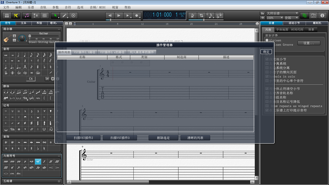 Overture中文版是一款专业的打谱软件,Overture最新版之中用户可以根据歌曲的MIDI格式文件快速进行五线谱解析,用VST音色插件让五线谱之间弹奏起来,这样用户就可以看懂并且通过其他乐器弹奏出来,对于音乐爱好者是一款实用的软件。