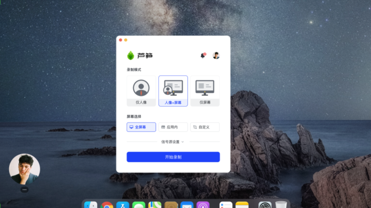 录制设置: 用户可以设置录制声音来源、摄像头开关、画中画模式等。