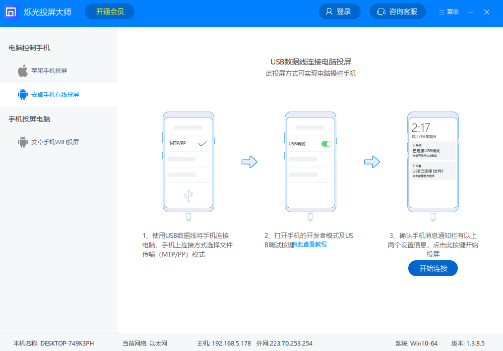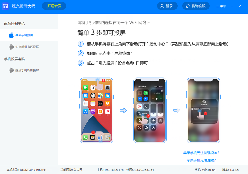 软件采用自研传输技术,确保手机画面以高清流畅的效果投射至大屏显示。