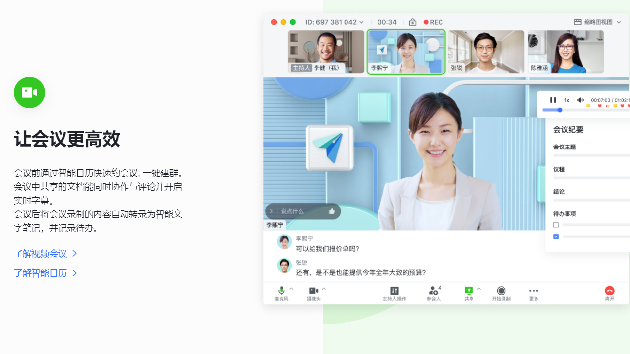 2、提供高清流畅的视频会议体验,支持屏幕共享,方便演示汇报、方案讲解等场景。会议录制功能便于回顾会议内容,会议室预约功能让会议安排更有序。