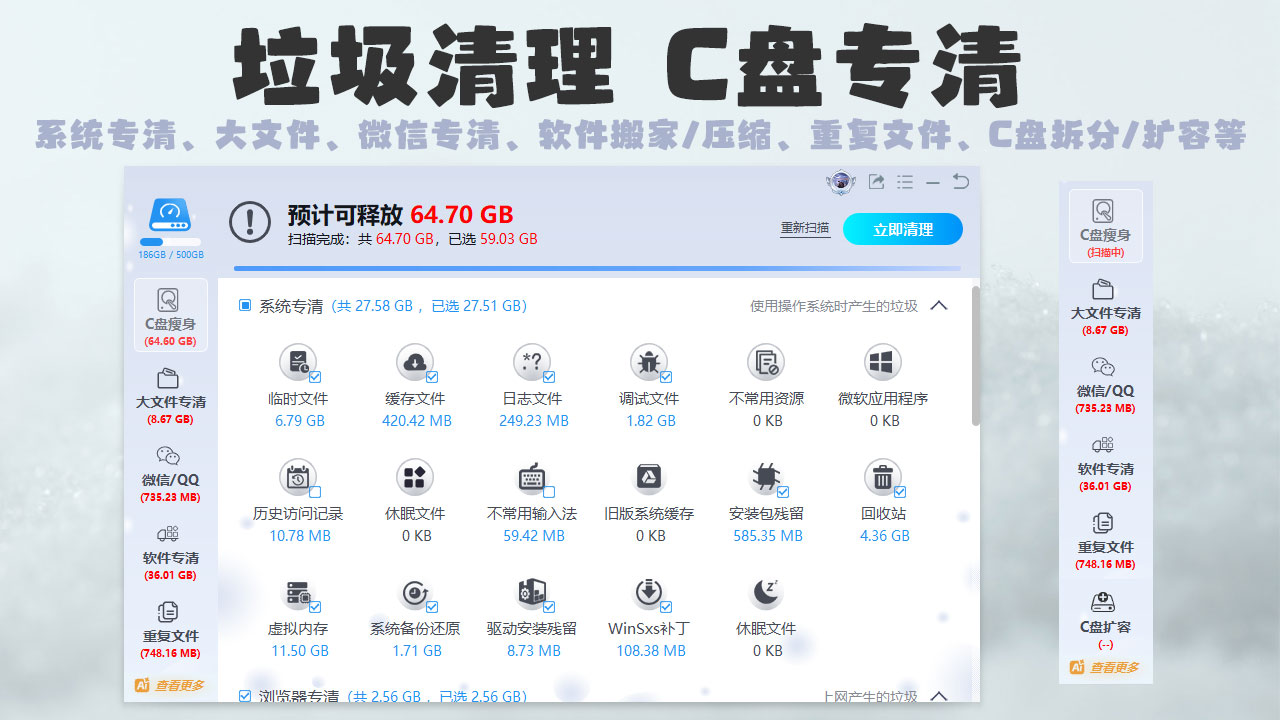 极智c盘清理是一款电脑C盘专用的清理软件,极智c盘清理免费版之中用户可以直接使用该软件快速扫描整个电脑的c盘,帮助用户可以快速完成数据扫描,并且整理出该设备的无用垃圾文件,我们可以直接在这里删除他们。
