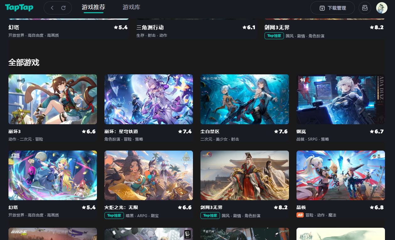 taptap是一款有着很多经典游戏的游戏平台,taptap电脑版之中用户可以在该平台上下载任意游戏,全部免费的特性可以让用户体验不少以前需要购买才能游玩的游戏,并且该软件之中提供许多手机游戏的电脑版本,喜欢玩手游的小伙伴可以体验下载试玩。