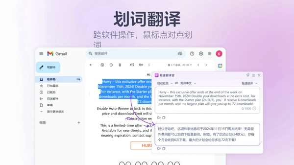划词翻译让用户在阅读外文资料时,只需用鼠标划过选中单词、短语,即可快速弹出翻译结果并支持复制粘贴;