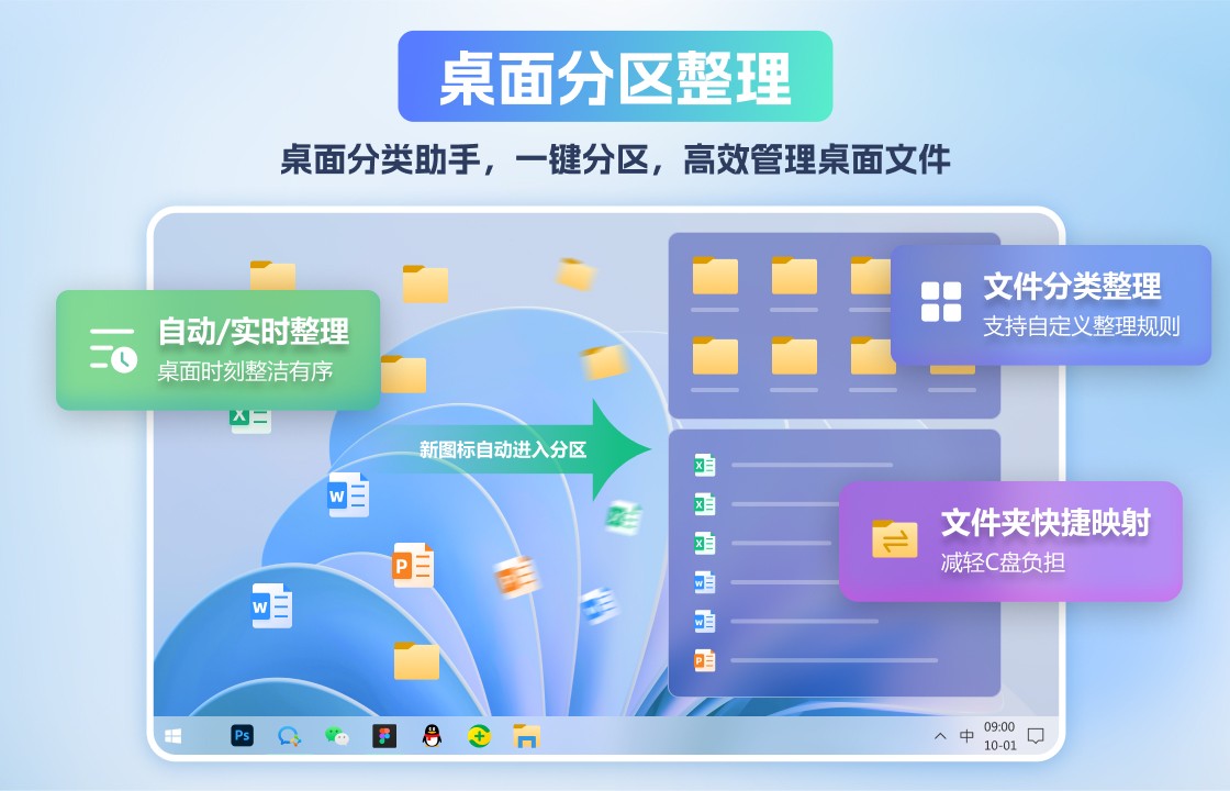 点击即可启动智能识别,自动分类文件与图标,快速规整杂乱桌面,大幅缩短文件查找时间,提升整理效率。