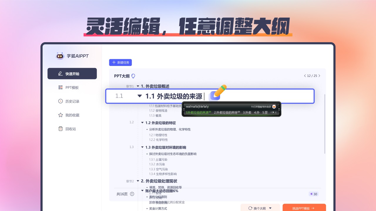 支持自由拖拽、插入、拆分大纲条目,灵活调整内容顺序与层级,掌控 PPT 结构。
