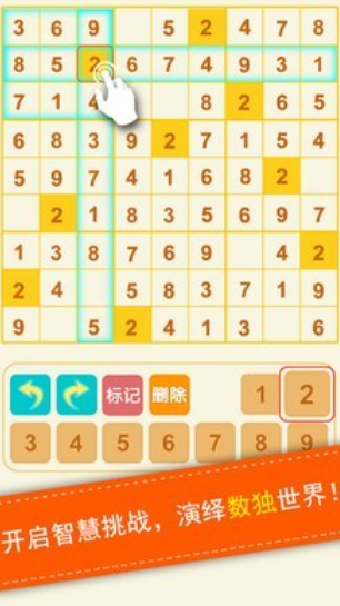 5、当你选中一个已有数字的格子,则包含相同数字的格子会高亮显示。你可以通过观察这个数字在每一行、每一列和每个小九宫格的排列来考虑下一步。