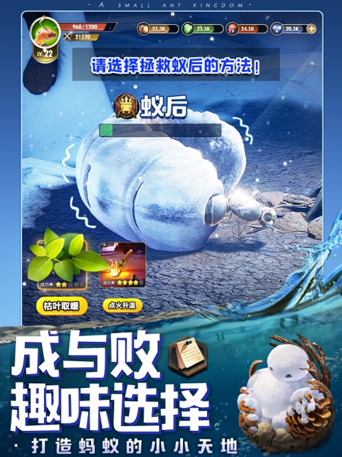 蚁巢资源探索:操控工蚁在蚁巢挖掘,获取天然泉眼、优质玉露等生存资源,开采泥潭、流沙等修补材料,规划蚁道保障蚁群生存。