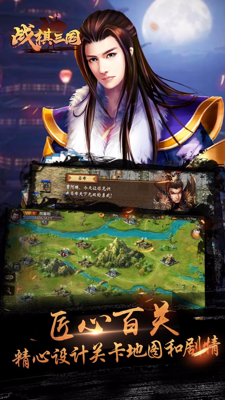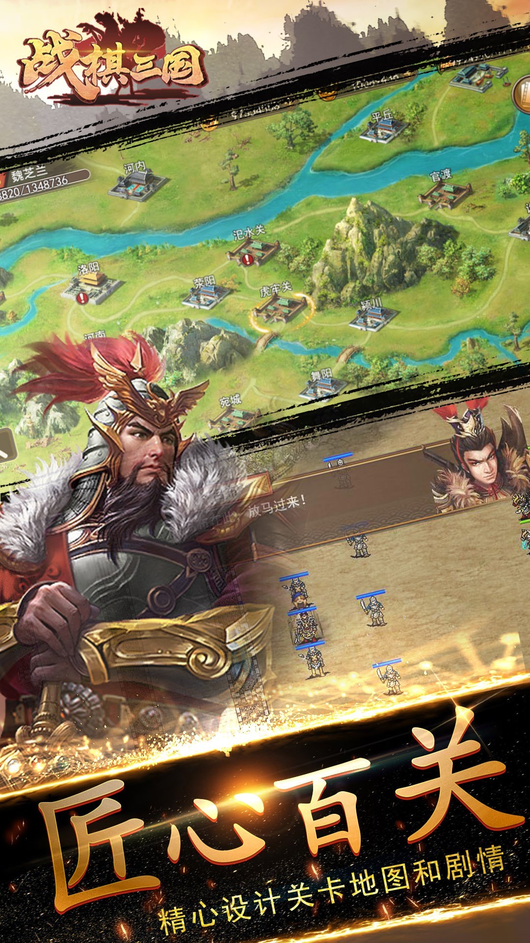 选择曹操、刘备或孙坚势力,征战300+关卡,通过策略布局击败敌军,解锁新武将。
