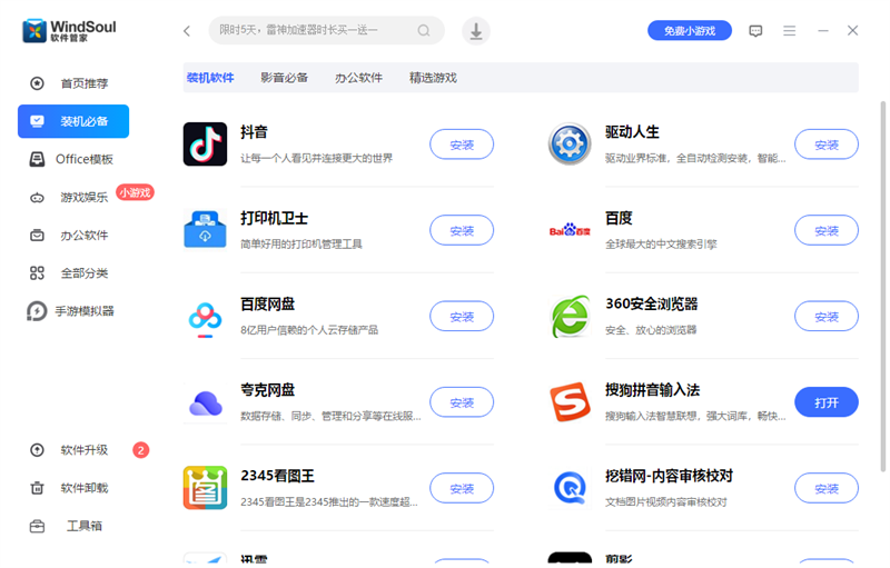 风灵软件管家将软件按照功能和用途进行分类,如办公软件、设计工具、开发工具、影音娱乐等,方便用户根据需要快速查找,内置强大的搜索引擎,用户可以通过软件名称、关键词等快速查找到目标软件。