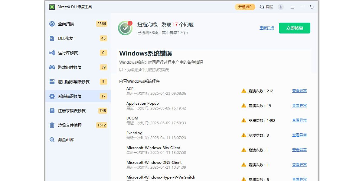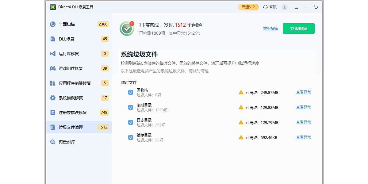 具备快速扫描功能,可自动检测系统中缺失的DLL文件及DirectX组件,精准定位问题根源。