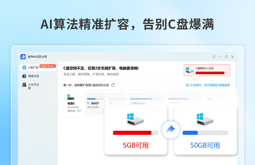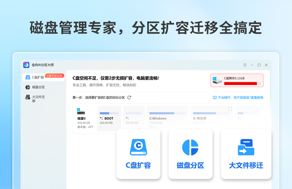 金舟AI分区大师是一款非常强大的磁盘分区工具,金舟AI分区大师电脑版可以帮助用户解决C盘内容过多造成内存爆满的问题,软件有着扩容功能,可以让用户从其他分区进行磁盘转移,转接更多的磁盘空间到达C盘,从而解决内存不足的困扰。