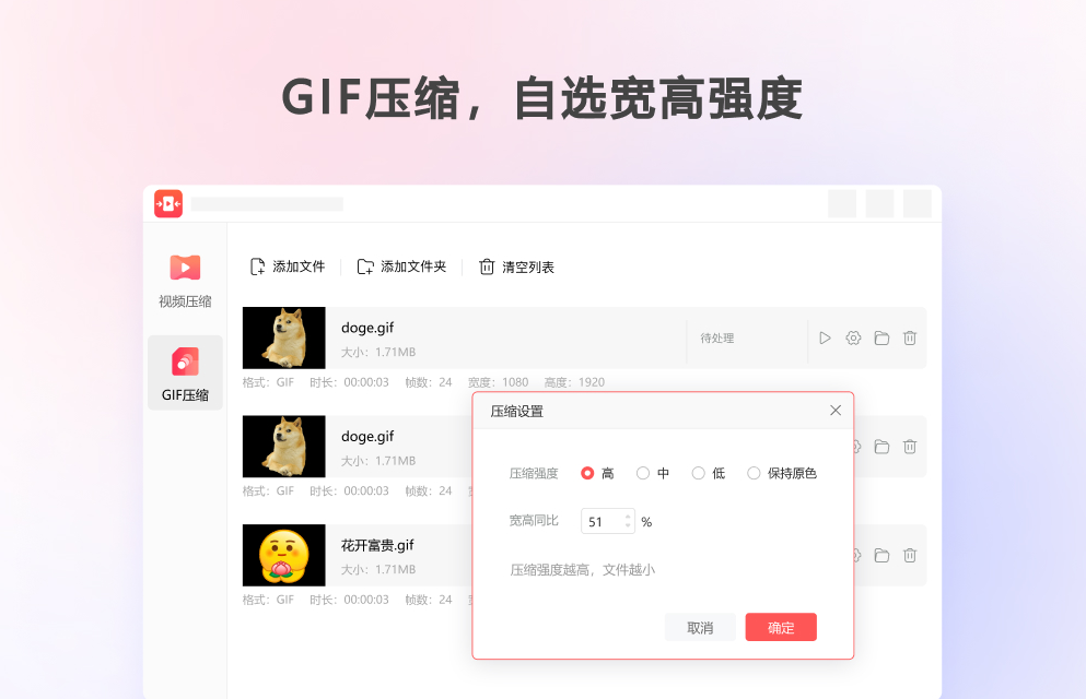 支持GIF图像一键压缩,可调节压缩参数,在缩小文件体积的同时优化显示效果。