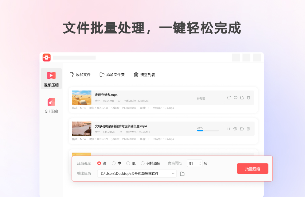 金舟视频压缩是一款好用的视频压缩工具,金舟视频压缩电脑版之中用户可以帮助用户进行各种文件压缩,软件有着批量压缩功能,让用户可以轻松做好视频内容压缩,精致的压缩功能,帮助用户轻松完成无损高清需求。