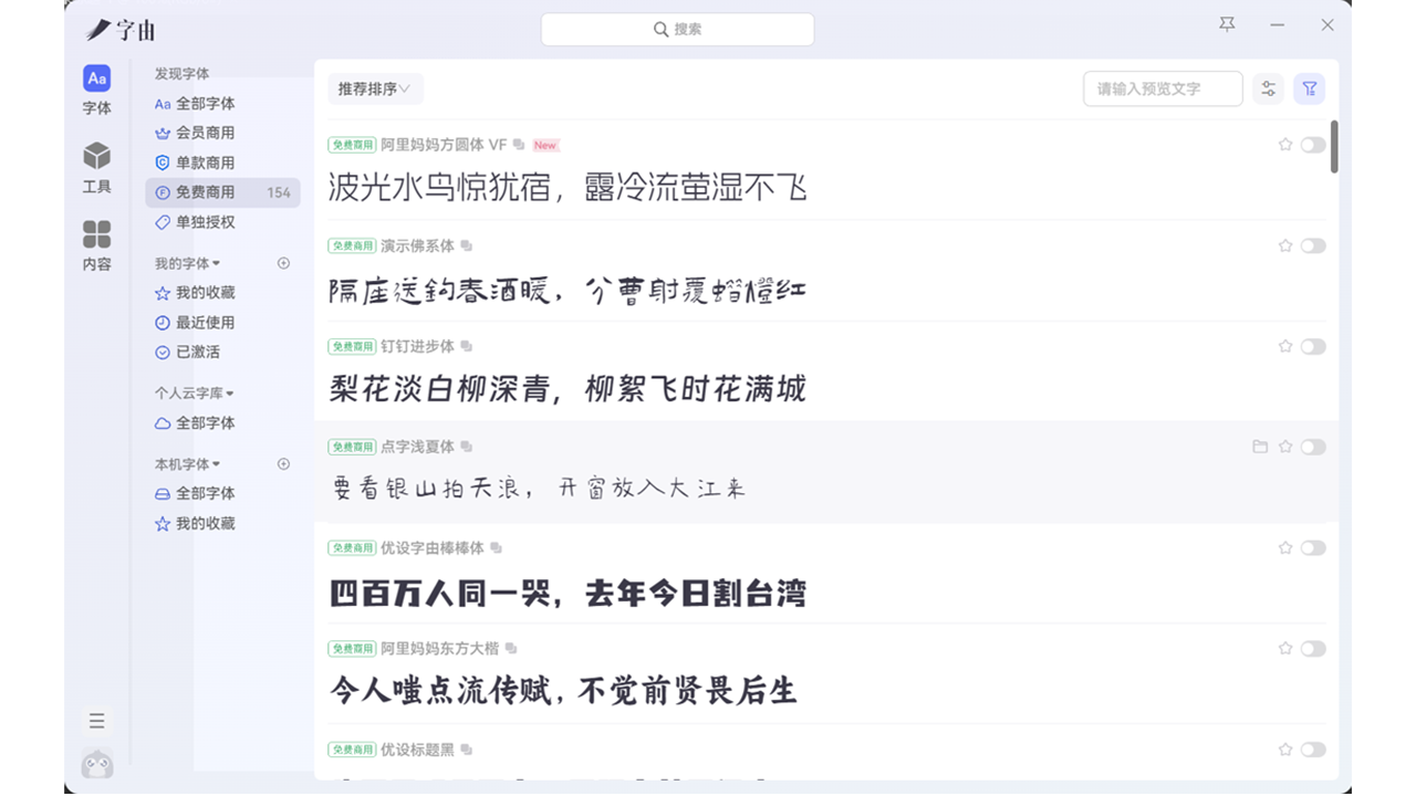 字体提供了非常便捷的字体搜索功能,用户可以通过输入关键词、选择字体风格、类别等进行快速筛选和查找,找到自己需要的字体,软件在下载字体之前,字由允许用户进行在线预览,确保选择的字体适合自己的设计需求。