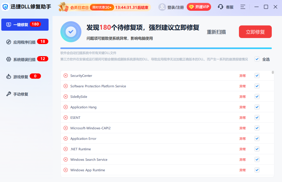 自动扫描并修复系统中缺失或损坏的DLL文件,提供一键化快速处理能力。