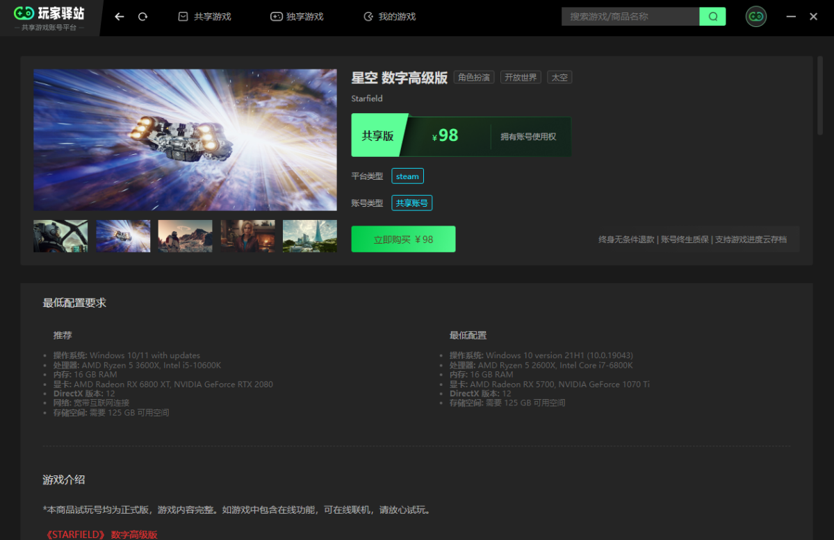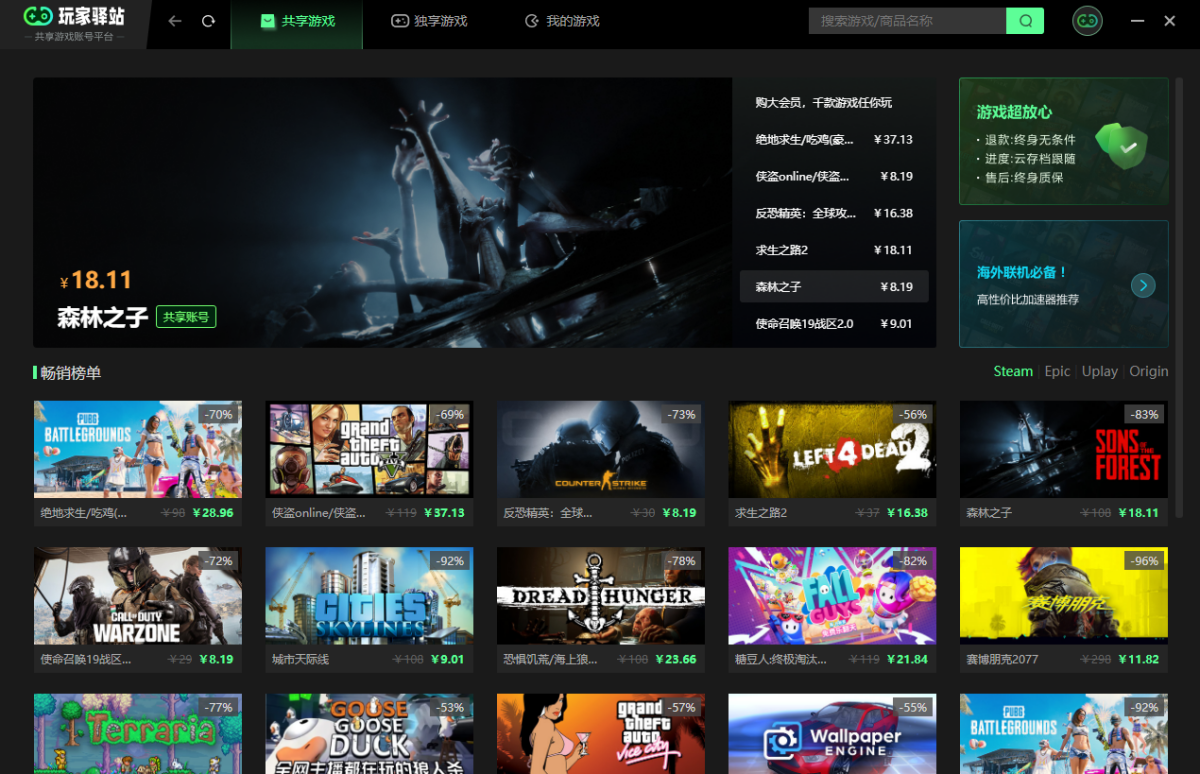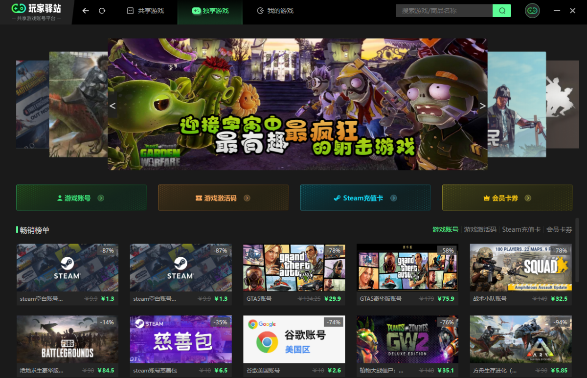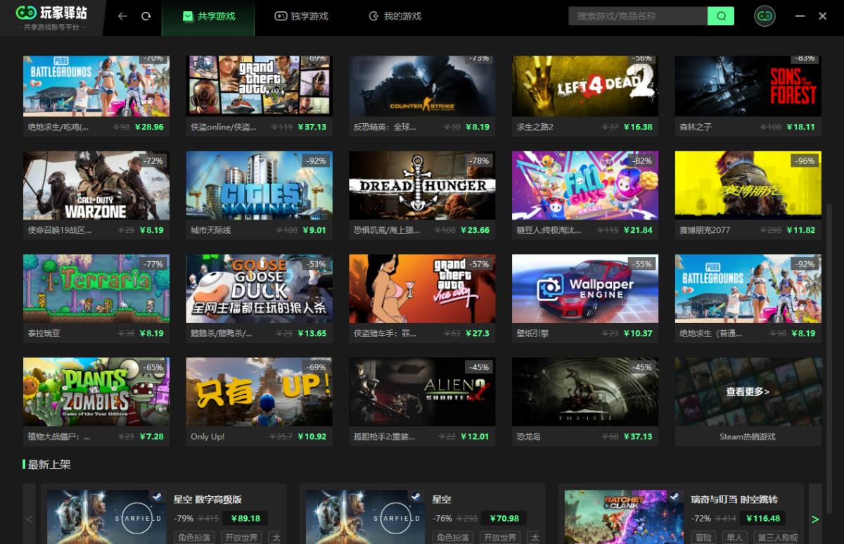 玩家驿站是一款好用的游戏购买平台,玩家驿站电脑版有着多种游戏购买方式,可以直接购买商品也可以购买共享服务,让用户可以以最佳方式获取喜欢的游戏,软件精选各种类型的优质游戏,让用户无需寻找游戏,而是打开软件就能看到喜欢的游戏。