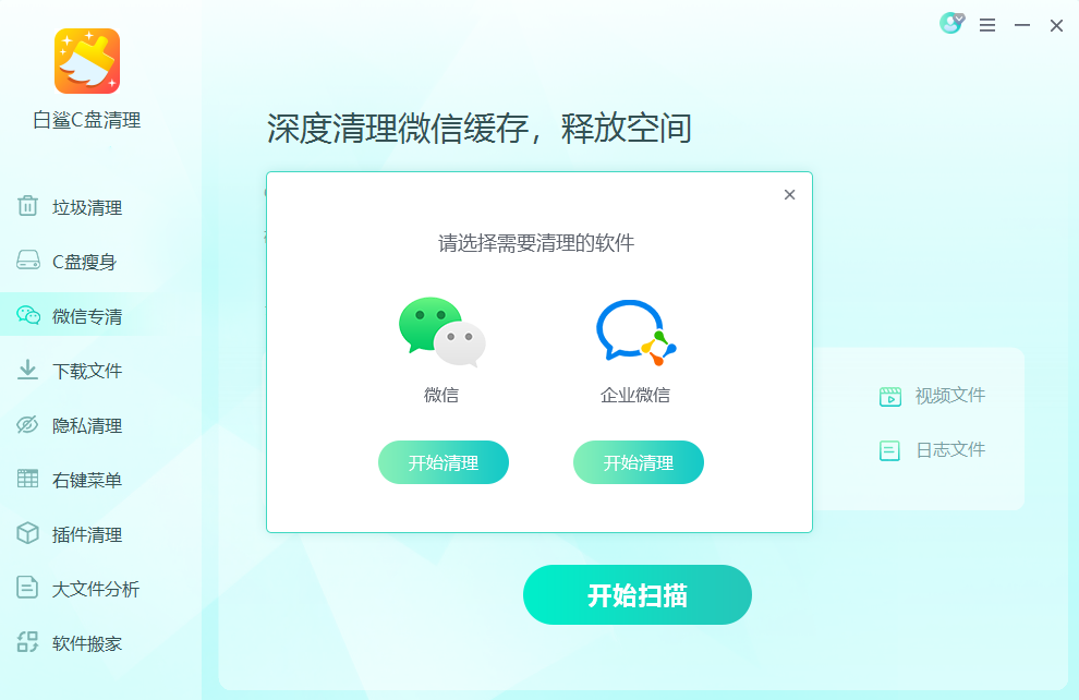 专项清理支持微信与企业微信的聊天文件、缓存及日志清理,可按时间筛选清理范围,避免误删重要数据。
