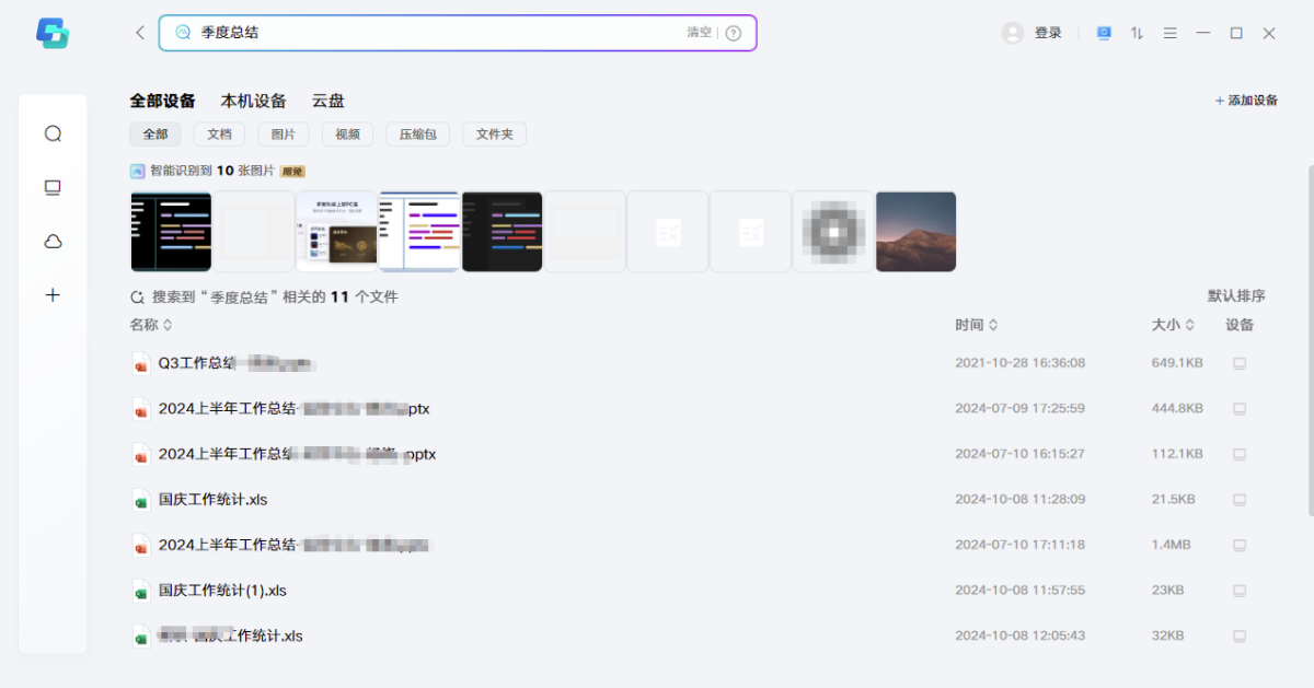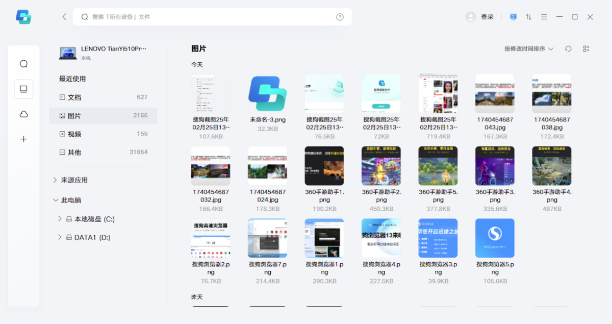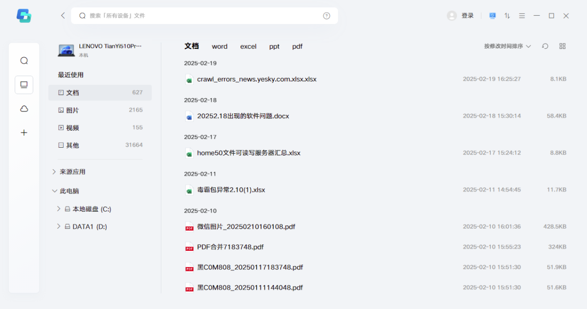 支持本地与云端文件的统一查看、编辑及分享操作,AI技术可自动按类型和时间维度智能分类文件。