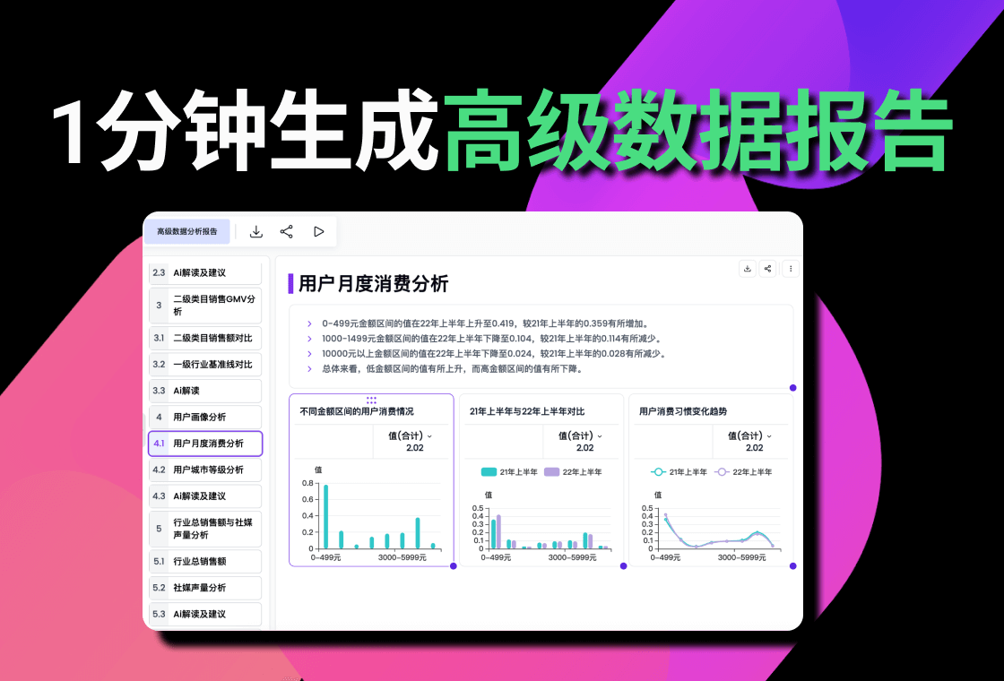 该工具可在一分钟内将原始数据转化为 20 页结构完整的高级数据报告,显著提升分析产出效率。