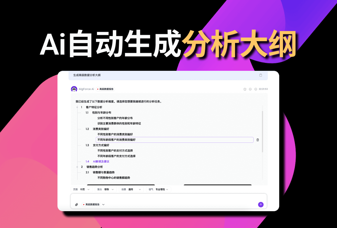 支持自动生成数据分析大纲,帮助用户快速构建分析框架,并提供多种分析维度与思路,可对分析路径进行灵活编辑。