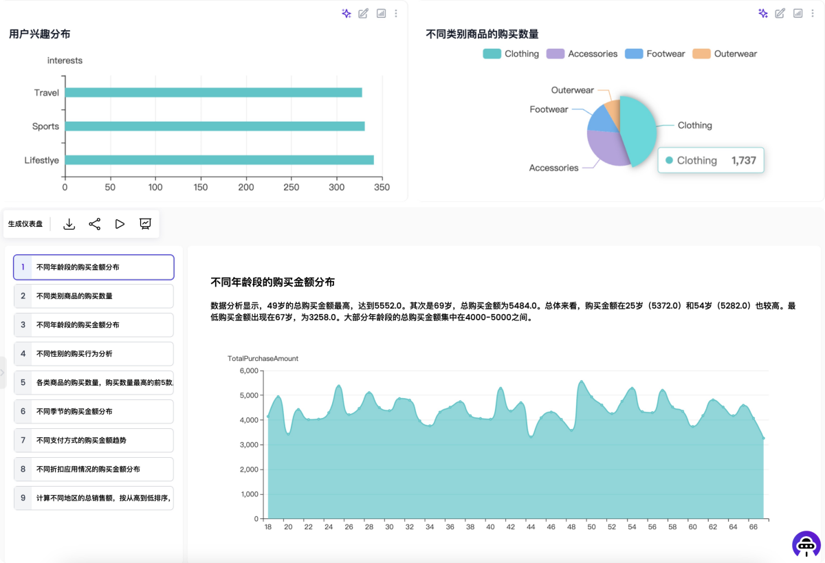 用户可一键从 Excel 文件生成个性化的数据可视化仪表盘,AI 能够自动推荐并创建合适的图表来呈现关键指标。