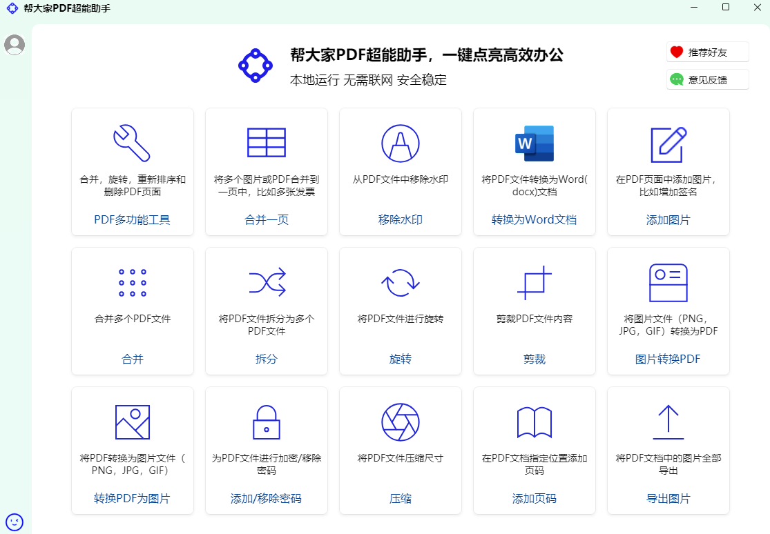 帮大家PDF超能助手是一款很好用的PDF工具,帮大家PDF超能助手电脑版之中用户可以快速将PDF文件进行拆分合并以及解压处理,软件支持用户使用多种PDF功能,可以快速帮助用户完成PDF文件处理。