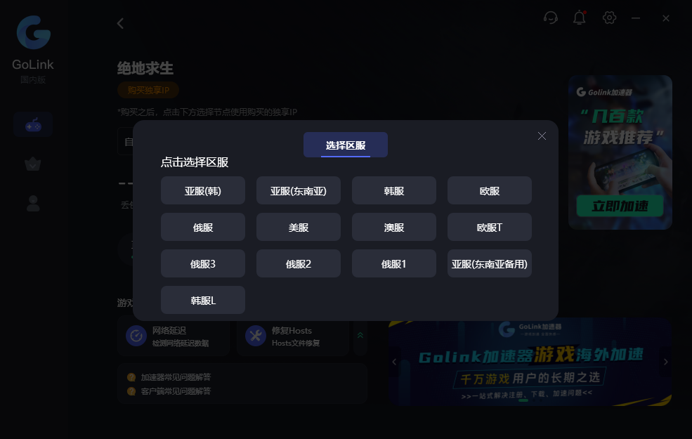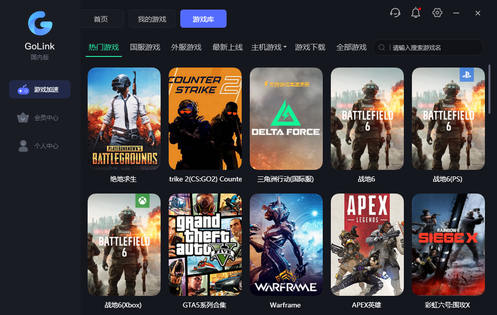 GoLink加速器是一款专用于游戏以及平台加速的网络加速器,GoLink加速器电脑版之中用户可以加速各种游戏平台以及游戏主体,让网络可以顺利的开启该游戏的内容,并且软件支持多种平台的交流和购买,让用户可以更好游玩。