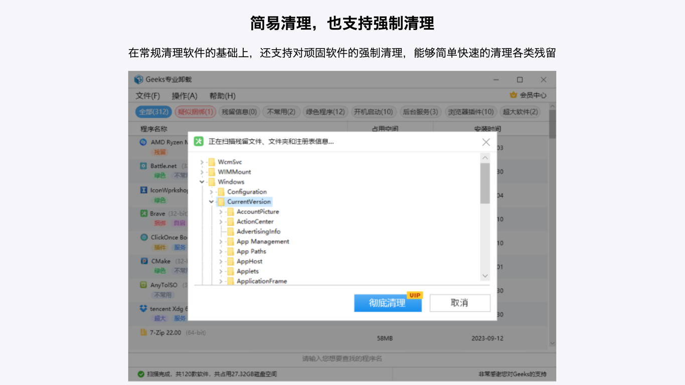 Geeks专业卸载软件能够针对损坏、无法正常卸载的软件提供强制清理功能,轻松移除各类卸载难题程序。