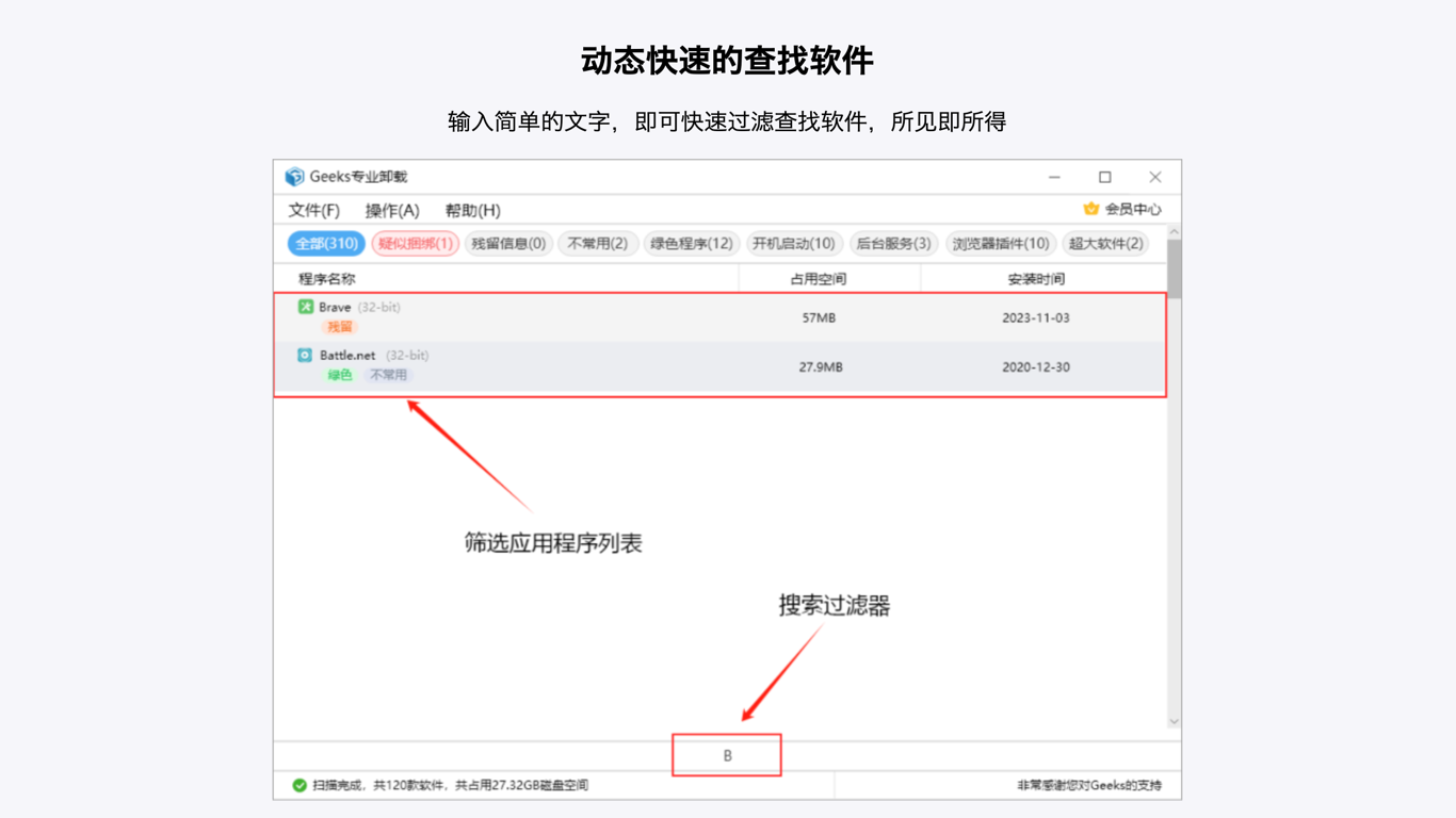 Geeks专业卸载电脑版是一款功能强大的软件卸载工具,Geeks专业卸载2026最新版能够深入系统,查找并删除所有相关的文件和注册表项,彻底清除不必要的组件,精准定位并完整清理,解决控制面板无法识别的问题,操作简单易上手,支持快速搜索过滤应用程序。