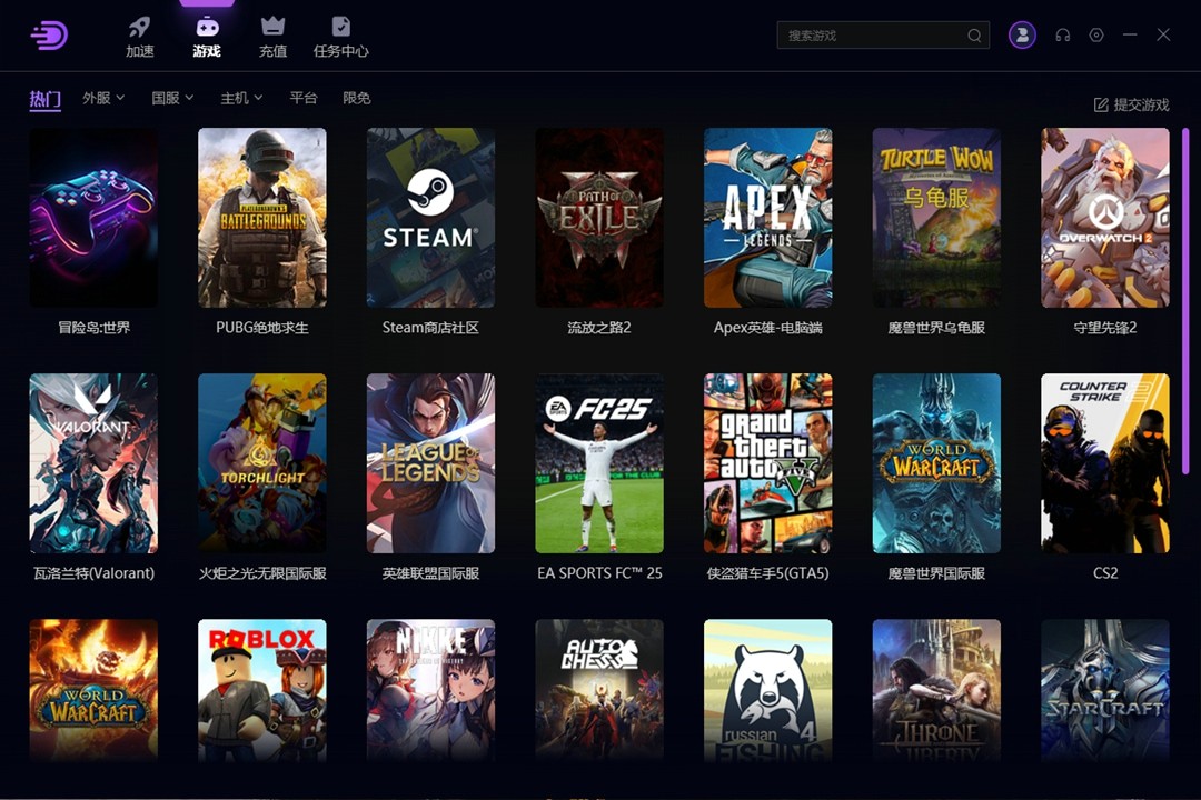 支持上千款国内外热门 PC 端游戏,适配各类主机及 Steamdeck 等新设备,冷门游戏也设专属加速入口,一键即可加速。