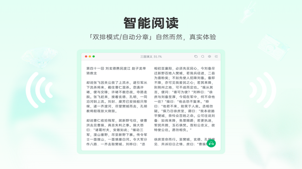 独创智能双排显示模式还原纸质书体验,自动分章断句 + 精准进度记忆,支持阅读画面、字体个性化自定义。