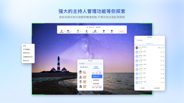 网络研讨会单场可支持 10000 人参与,支持主持人、嘉宾、普通成员分级管理,适配大型活动与培训场景。