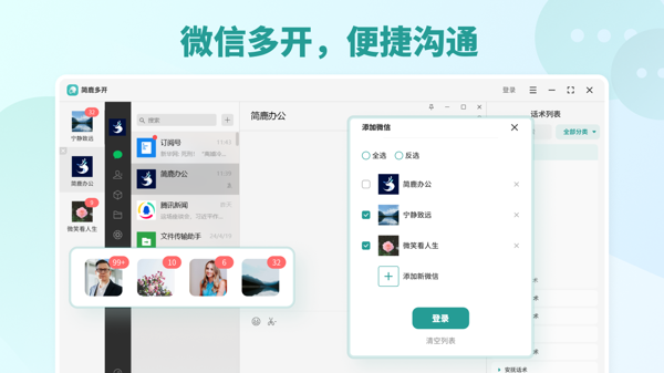 简鹿多开软件是一款高效的微信多开软件,简鹿多开2026电脑版可以在同一台电脑上同时登录多个微信账号,轻松管理个人、工作、商务等不同账号,能够快速接收和发送消息,让各个账号之间的消息处理不延误,提高工作沟通的效率。